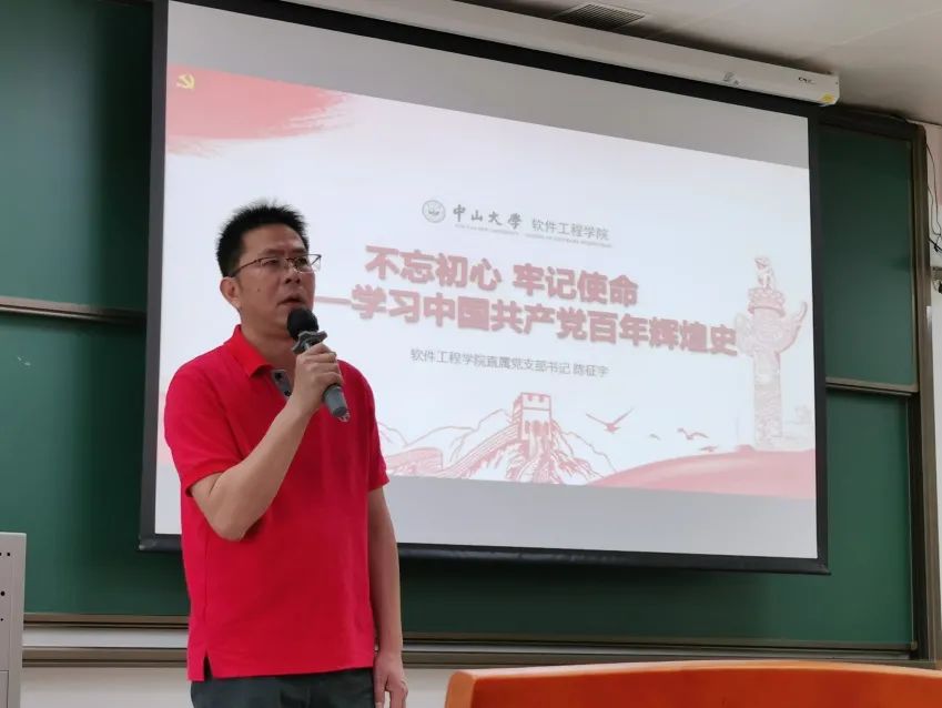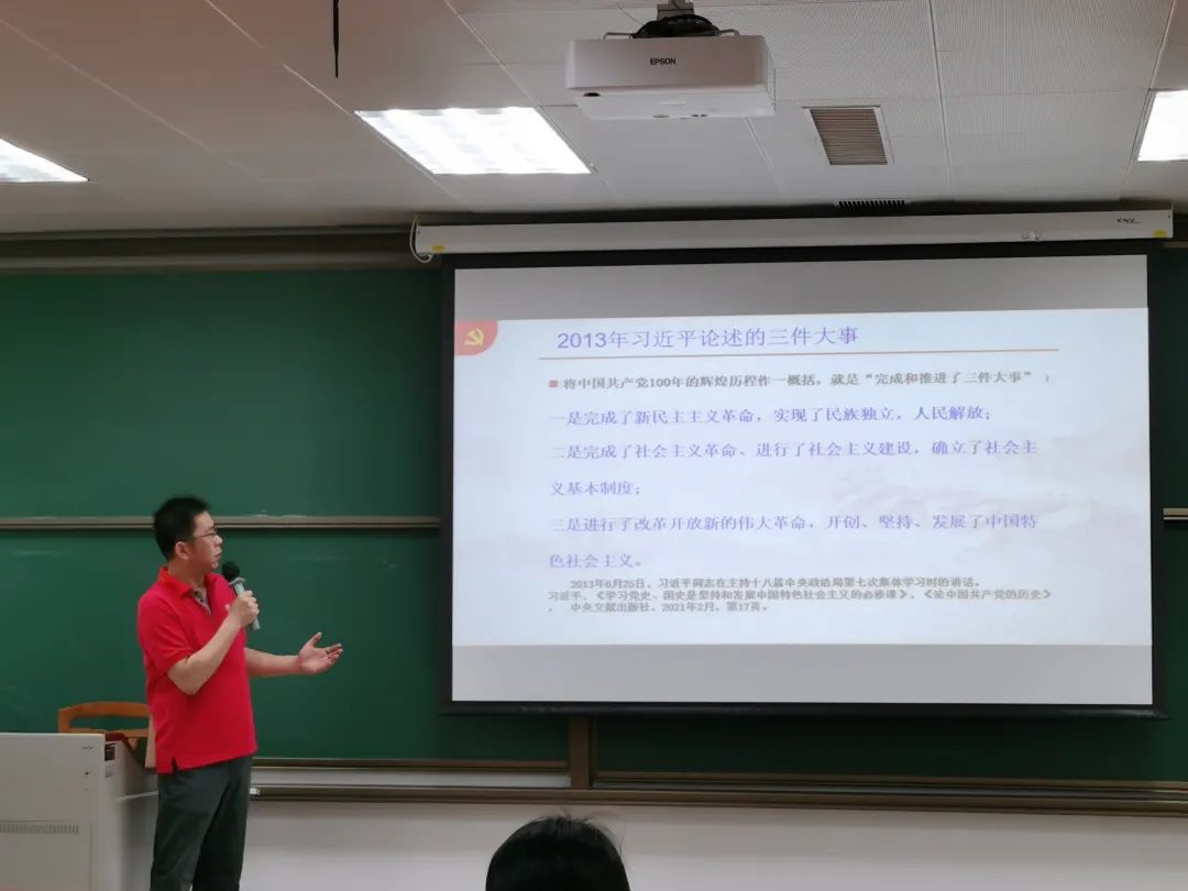 陈征宇书记还梳理了中国共产党百年历史的基本脉络。他指出,将中国共产党100年的辉煌历史作一概括,就是“完成和推进了三件大事”。他强调,中国共产党人的初心和使命就是为中国人民谋幸福,为中华民族谋复兴,人民是党的根本政治立场。他还介绍了中国共产党建党初期的几大重要历史事件,有助于同学们形成系统的历史观。