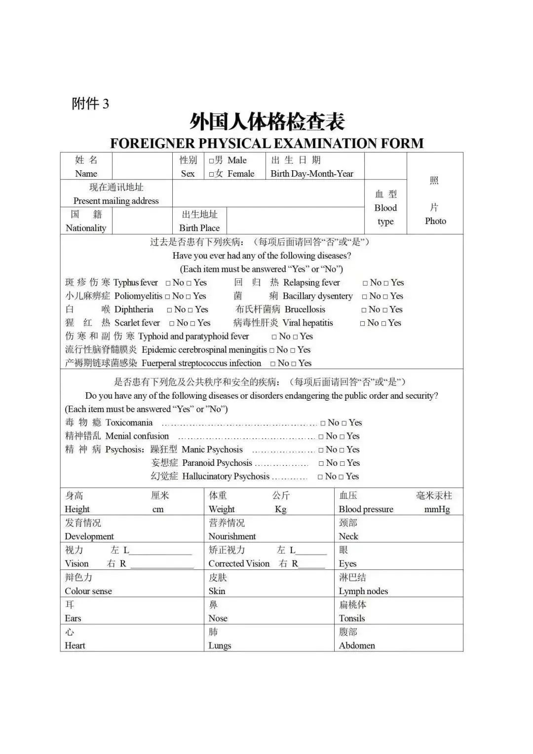 检查结果须加盖医院公章,有效期6个月(模板见附件3)。现居住中国大陆境内,持有有效“外国人居留许可”或“外国人永久居留身份证”者,可用以上两个材料之一替代模板《外国人体格检查表》。