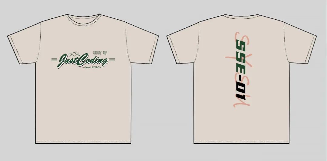 正面的印花图案由几大元素组成:英文“shut up”和“Just Coding”,意为少说多做,动手实践与千百遍的练习才是解决软件工程问题的真谛,这与本院的教学理念和办学宗旨相吻合;“since 2020”表示本院建院于2020年;山脉与初升太阳的简笔画元素象征着本院充满希望的崭新面貌,同时也象征着软工学子年轻的生命力与创新活力,未来可期;正面印花图案两侧各有三条杠图案,中和了主图较强的曲线感使其不显得过于散漫,更加有规则感;正面图案主要颜色采用了墨绿色,充满朝气又不显轻浮跳脱,大气沉稳又不显沉闷,与杏色底色搭配和谐。