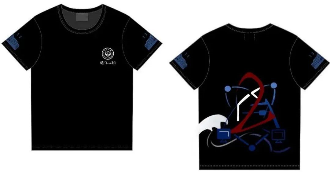 我们设计的班服款式是短袖T恤,颜色以黑色为底色,其它颜色的图案显得简单大气。班服正面白色的校徽和“软工2班”的文字印在黑色的背景上,代表着我们会像在夜幕上的星辰一样吸引人的目光。班服的背面由三个图案组成:蓝色(渐变)的链状图案,代表着我们学院的特色科研方向——区块链技术;深蓝色的连接在一起的电脑,代表着我们学院的特色科研方向——分布式计算,同时它们也是我们每天学习都要用到的工具;中间红色的“2”字代表我们21级2班,红色象征着我们年轻人对学习和生活的热情以及对学校和学院的热爱;两袖袖口还印着我们雷竞技raybet登录入口的学院楼图案。