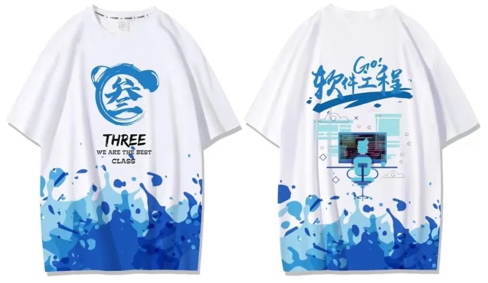 (方案2)以蓝白为主色,干净而有力;下方的蓝色装饰,像海浪,寓意我们要不怕困难、乘风破浪,也像颜料的随意泼洒,寓意不受拘束,突破自我,敢于创新;正面有 “叁”,背面有“软件工程”字样,表明我们作为软工22级三班学子的信息;背面还有程序员的图案,与上方的“软件工程”呼应。心之所向,素履所往。