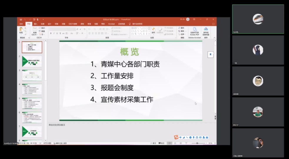 软工青媒中心主编张泽凯同学首先向成员明确了采编部、美工部和综合部的工作职责,再详细介绍了软工青媒中心的运行机制,包括成员的分工和工作量安排、月度报题会的完整流程和采集学院宣传素材的日常化任务等,让同学们对未来在软工青媒中心工作有更多把握。此外,他与周玉婷老师还耐心地回答了新成员对软工青年媒体中心工作的相关疑问,并表达了对与各位同学共同成长进步的期待。