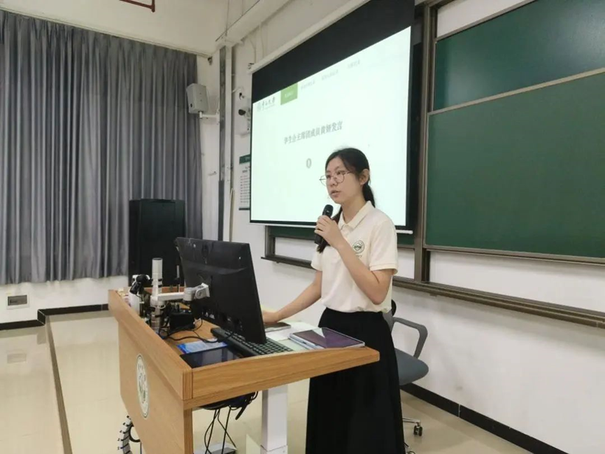 院会主席团成员黄妍同学给新成员详细介绍了学院学生会的组织架构与各部门职责分工,并代表主席团进行了年度工作总结,全面回顾了院会一年来的工作成果。