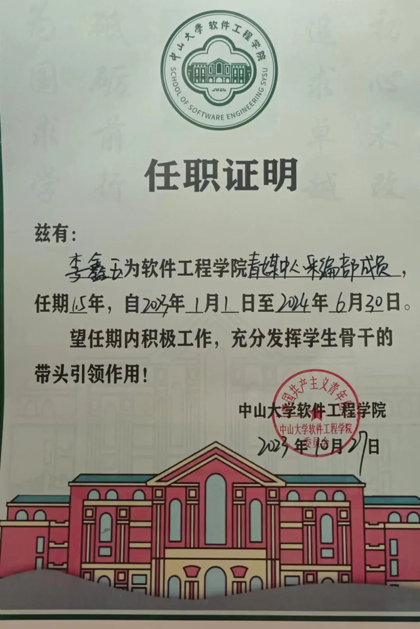 学生工作方面,李鑫玉担任了学院2022级本科生1班的班长。任职期间,她认真履行自己的职责,经常与班级同学交流,了解他们的需求,并与学院沟通协调资源,帮助他们解决问题。同时她还精心组织了各种班级活动,以此增进同学们之间的友谊和提高班级的凝聚力。